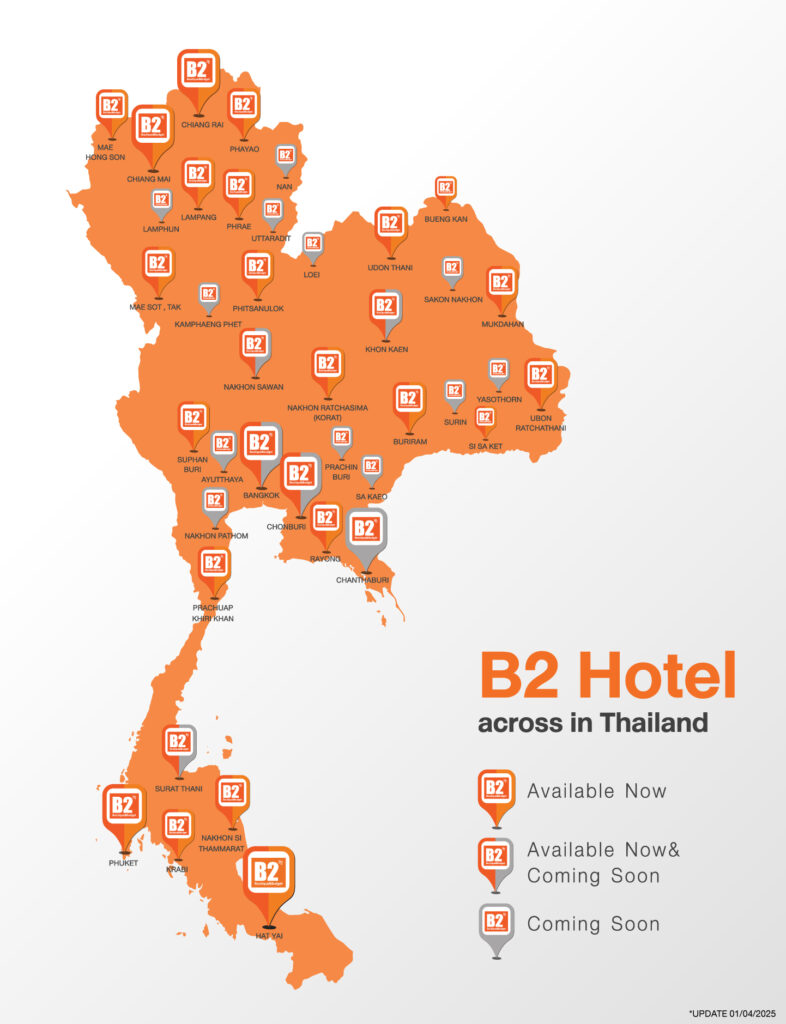 With 76 branches across 27 provinces in Thailand and over 5,897 rooms, B2 Hotel Group proudly stands as the largest budget hotel chain in the country. Committed to continuous expansion, the group aims to meet the needs of both Thai and international travelers by offering exceptional value and world-class standards.