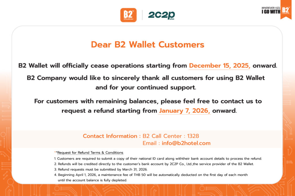GPCM Group Co., Ltd. would like to inform all customers and service users that the Company will officially discontinue the B2 Wallet application, an electronic wallet system that has been continuously provided to our customers. The service will formally come to an end on December 15, 2025.