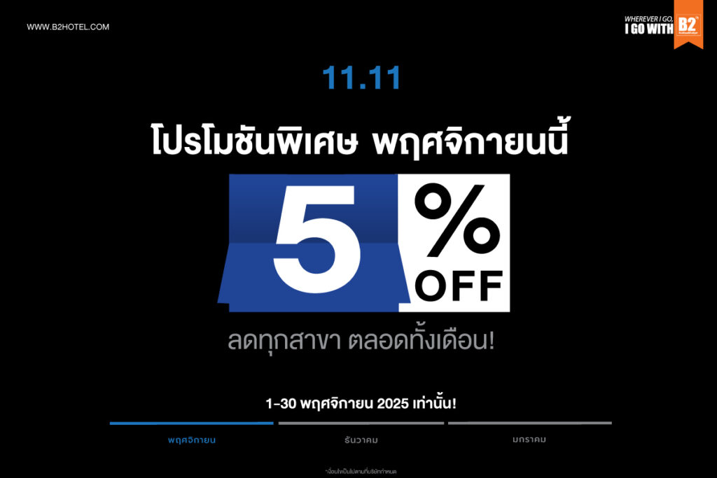 โปรโมชันสุดพิเศษแห่งปี 11.11 จาก B2 Hotel กลับมาแล้ว! พักสบายทั่วไทยในราคาสุดคุ้ม ลดทันที 5% เมื่อจองผ่านเว็บไซต์