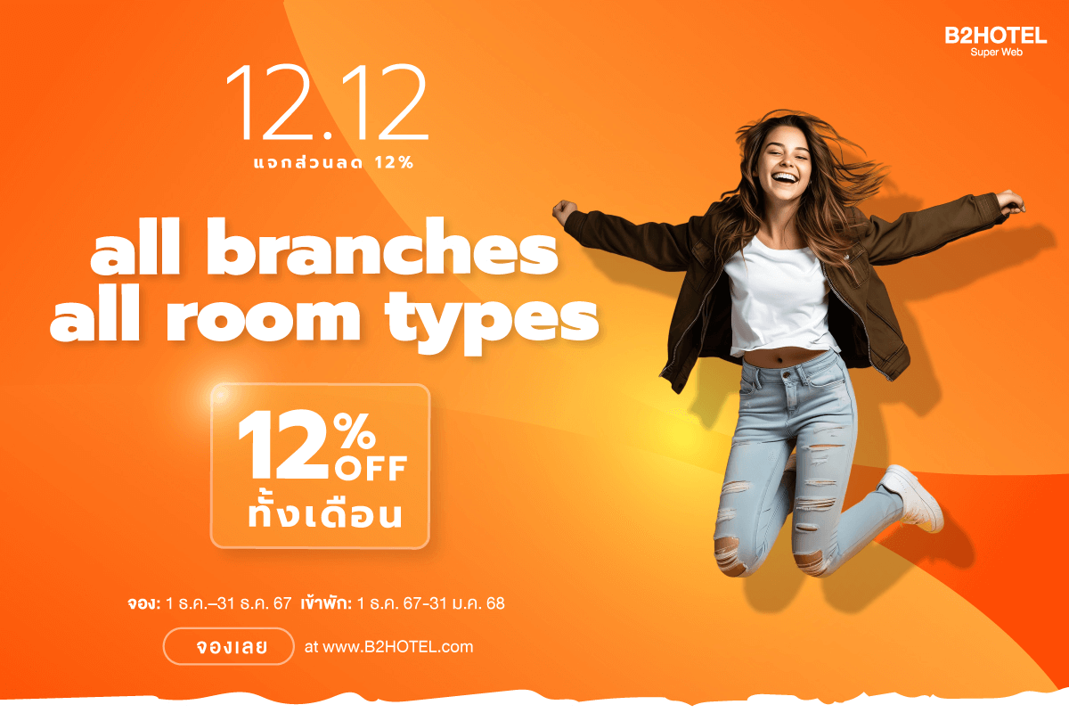 ส่วนลด 12% ตลอดทั้งเดือนธันวาคม สำหรับ B2 ทุกสาขาทั่วไทย ไม่ว่าจะเป็นทริปต้อนรับปีใหม่หรือการเดินทางเพื่อพักผ่อนกับคนพิเศษ เพียงจองผ่าน www.b2hotel.com เท่านั้น มาร่วมสร้างช่วงเวลาที่น่าจดจำกับ B2 Hotel ในเทศกาลแห่งความสุขนี้