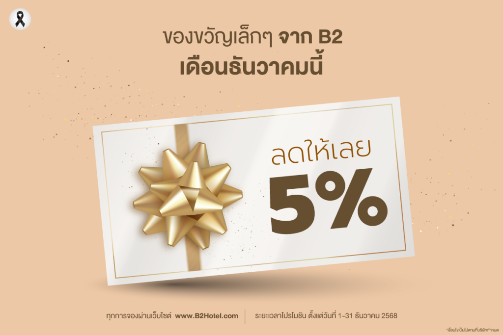 ของขวัญส่งท้ายปีจาก B2 Hotel โปรโมชันเดือนธันวาคม ลดทันที 5% ทุกการจองผ่านเว็บไซต์